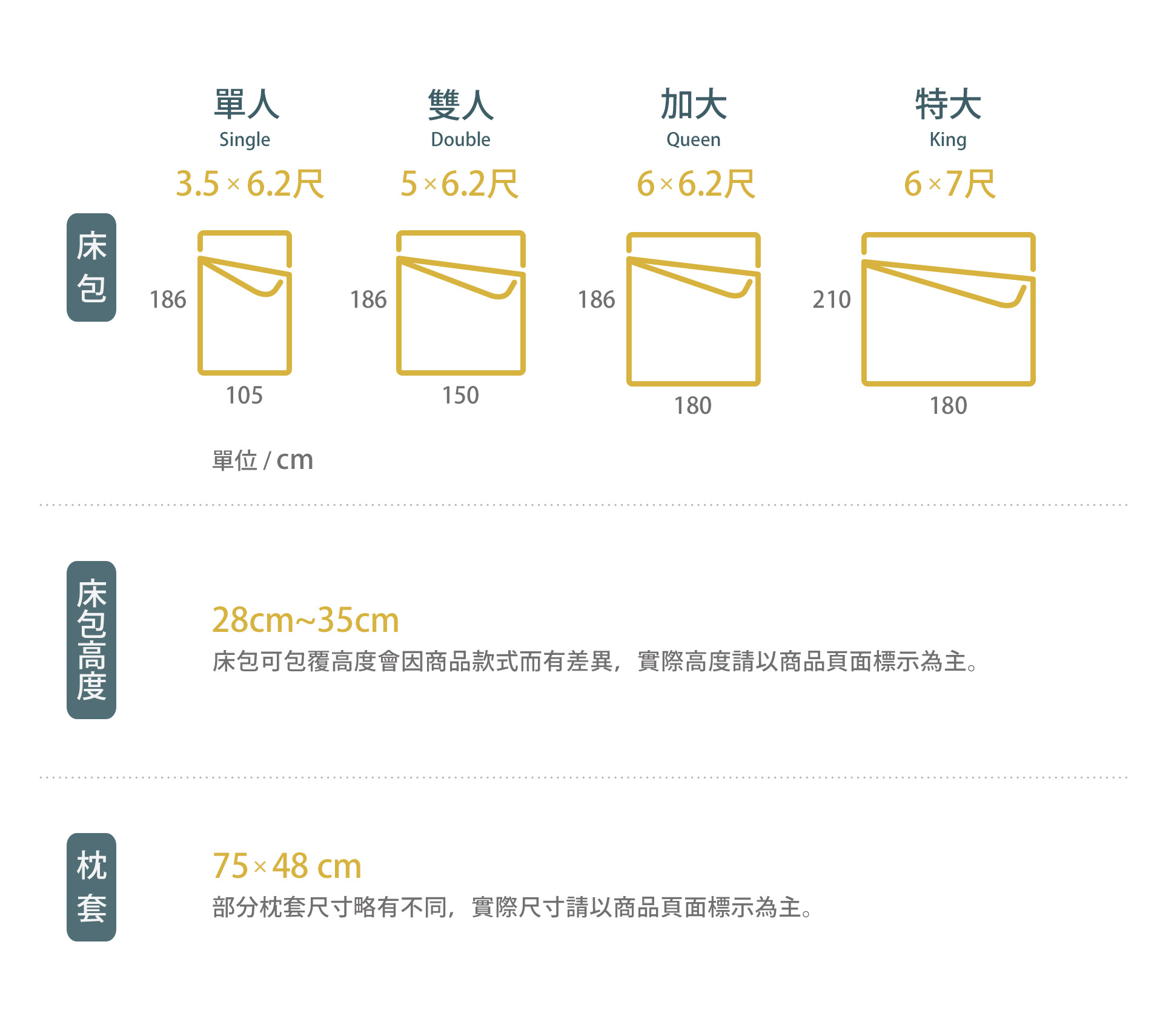 - 部分【單人】尺寸的【枕套數量】略有不同,詳情請參考各商品賣場下方的尺寸說明。