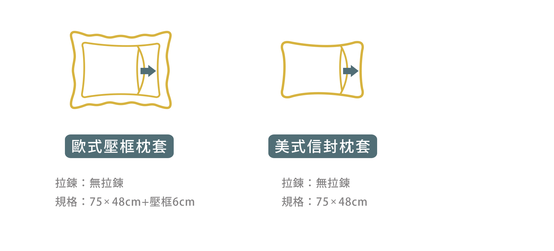 枕套款式分為【歐式壓框枕套】與【美式信封枕套】,歐式壓框枕套於枕套四邊有裝飾壓框設計。