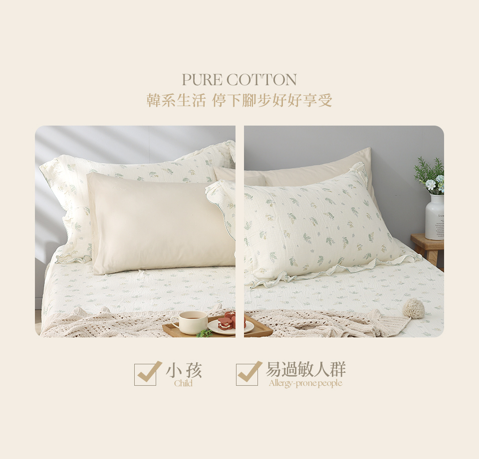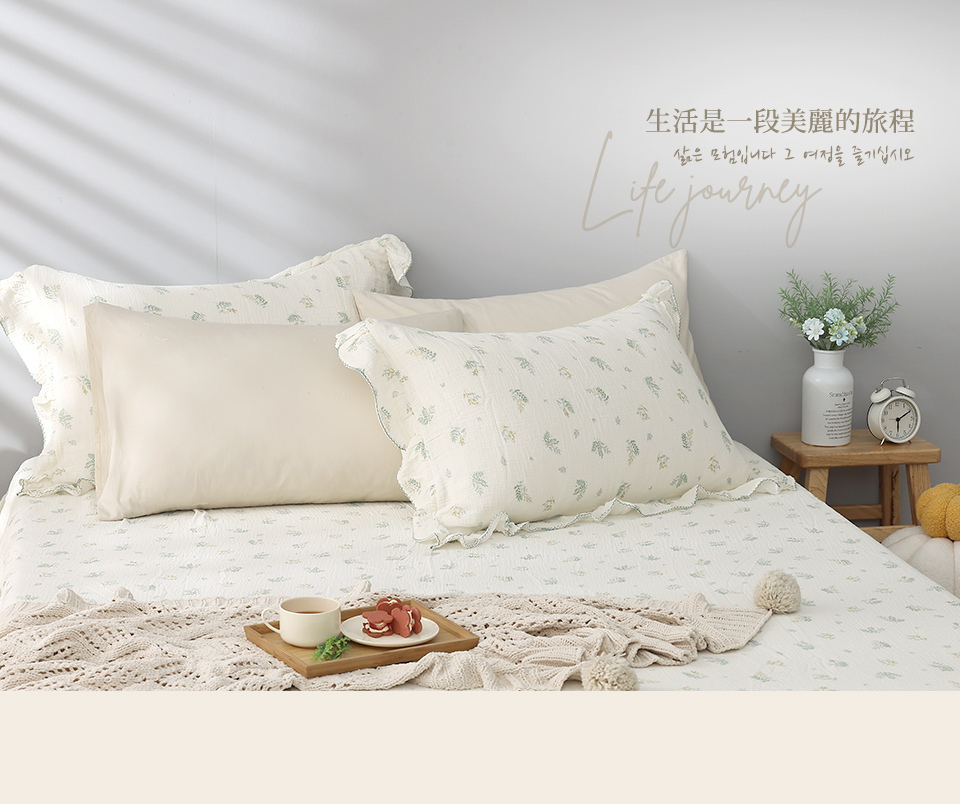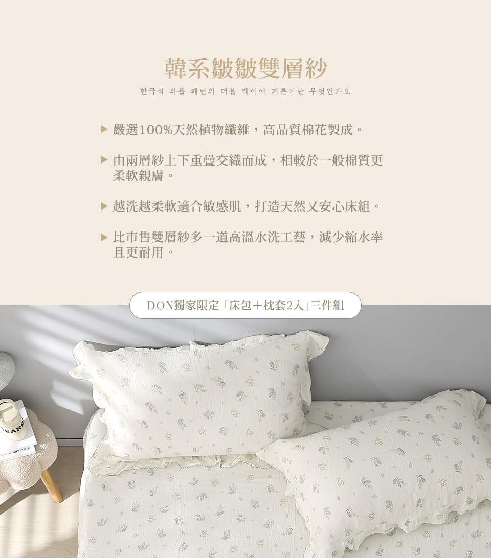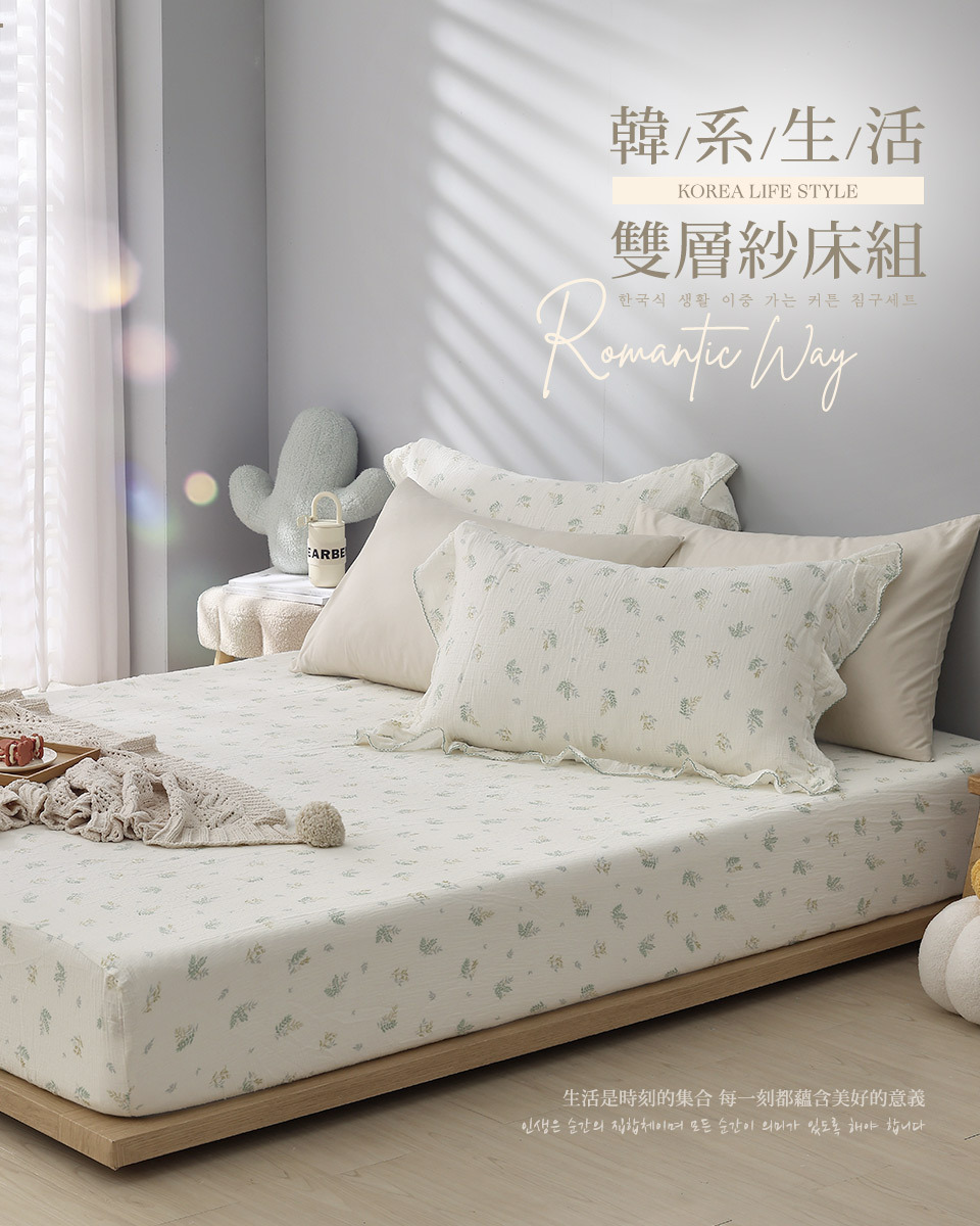 (單人/雙人/加大) / 韓系波浪邊純棉雙層紗床包組 / 綠意靜謐 / DON HOME