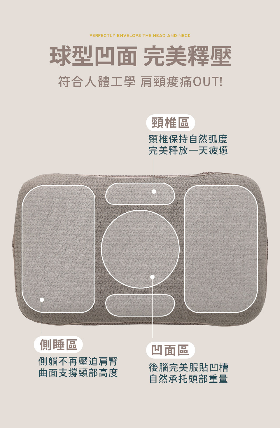 球型凹面人體工學設計,貼合頸部護頸深睡